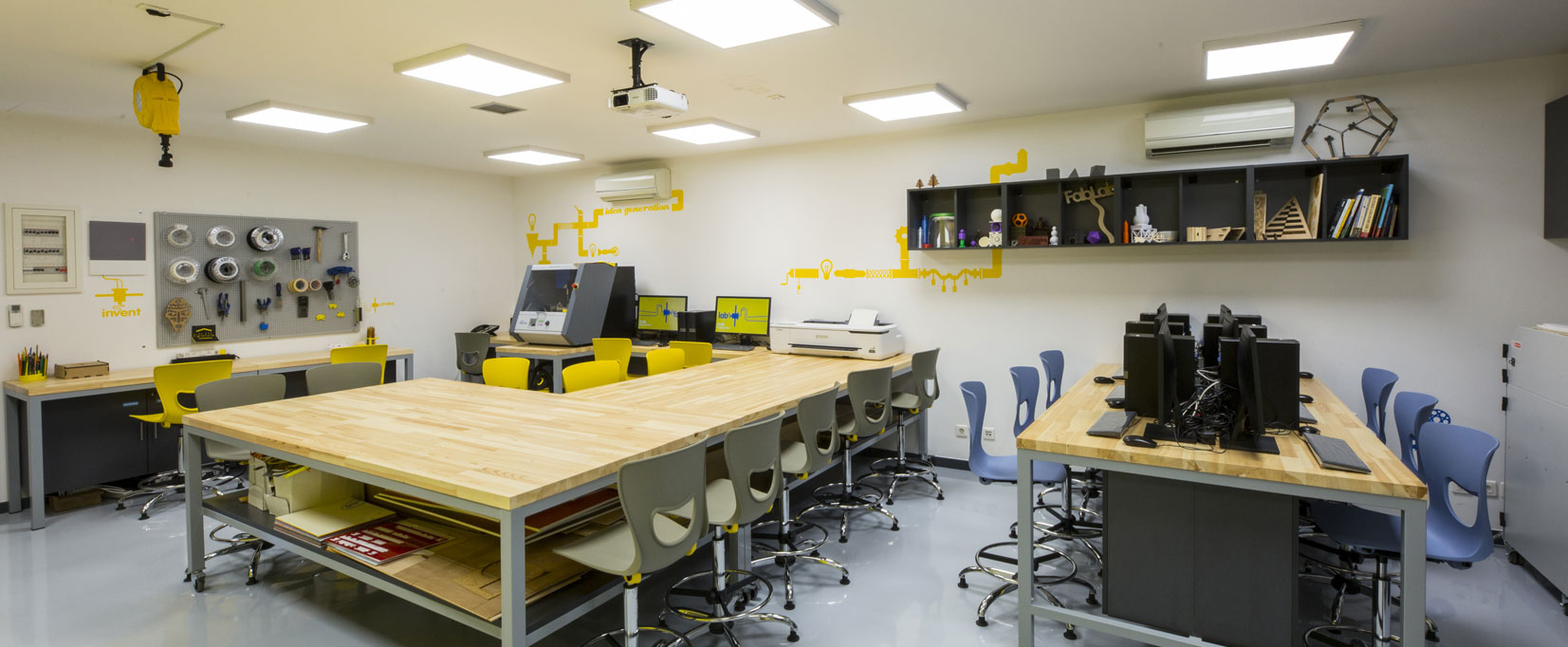 The space is equipped with 3D printers, a laser cutter, a 3D scanner, a vinyl cutter, a CNC machine, robotics kits and an electronics workbench for experimenting with creative electronics, such as sensors, microcontrollers, conductive ink, e-textiles, etc. With its possibilities for digital construction and other cutting-edge technologies at students’ fingertips, the lab aims to familiarize students with technology and engineering, so that they understand Mathematics in depth and love the Arts and Sciences.