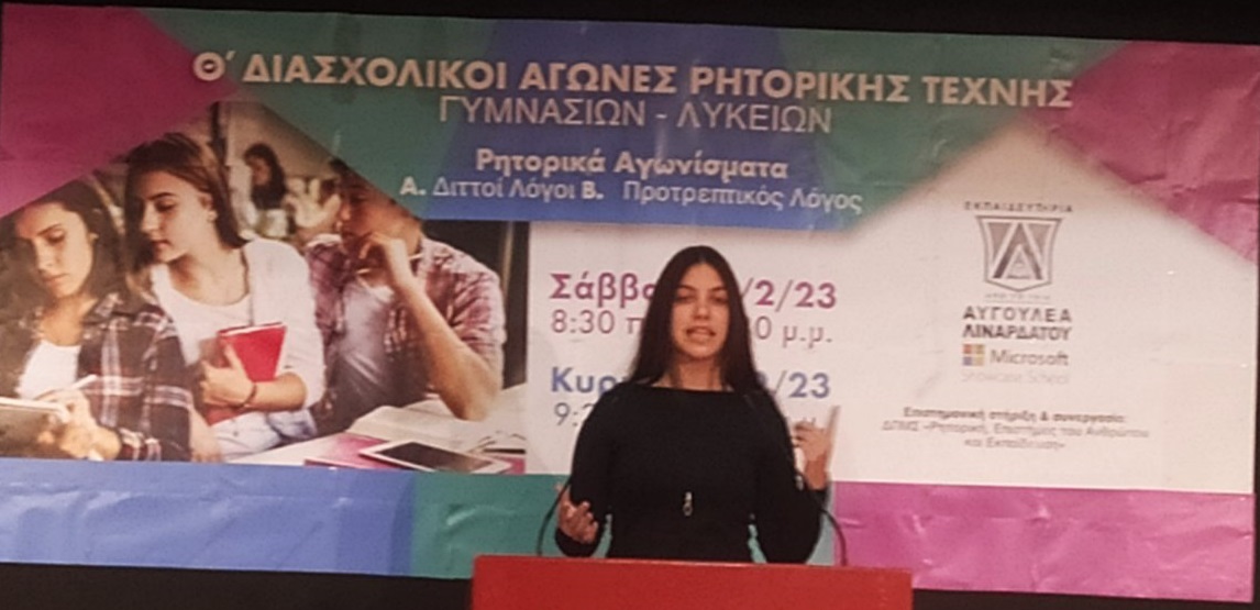 Θ΄Διασχολικούς Αγώνες Ρητορικής Τέχνης Γυμνασίων και Λυκείων που διοργάνωσαν τα Εκπαιδευτήρια Αυγουλέα- Λιναρδάτου. Οι μαθητές μας διαγωνίστηκαν με συμμαθητές τους από άλλα 49 σχολεία.