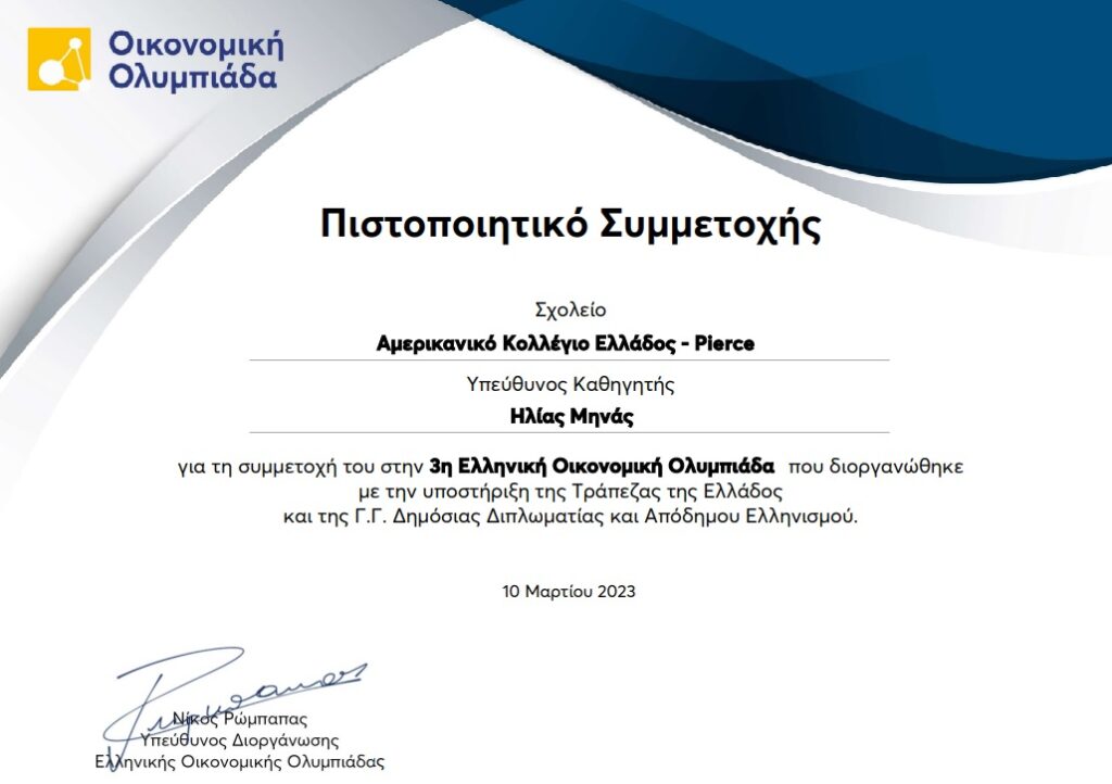 Είκοσι μαθητές του Pierce προκρίθηκαν στον επόμενο γύρο της Οικονομικής Ολυμπιάδας, από τους 42 συμμετέχοντες, αποτέλεσμα - ρεκόρ και μοναδικό σε εθνικό επίπεδο, ενώ τρεις ακόμη μαθητές μας δενπροκρί