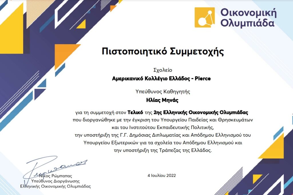 Η μαθήτρια του ΙΒ2 του Pierce Μαρία Τουρνή θα συμμετέχει στην 5μελή ομάδα που θα εκπροσωπήσει την Ελλάδα στην Οικονομική Ολυμπιάδα που θα διεξαχθεί στις 7 και 8 Σεπτεμβρίου στη Βουδαπέστη. Η Μαρίαείχ
